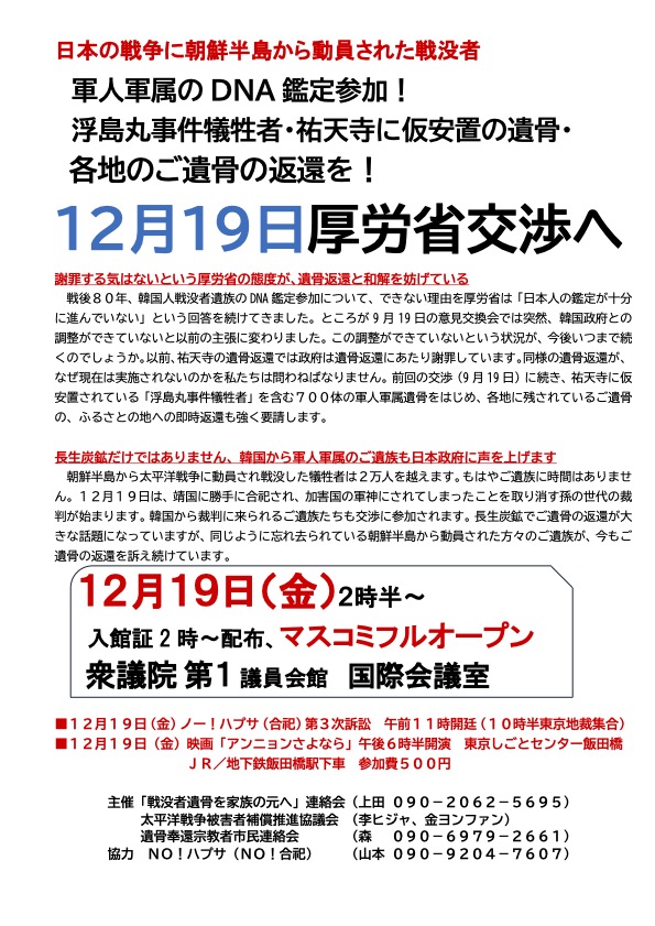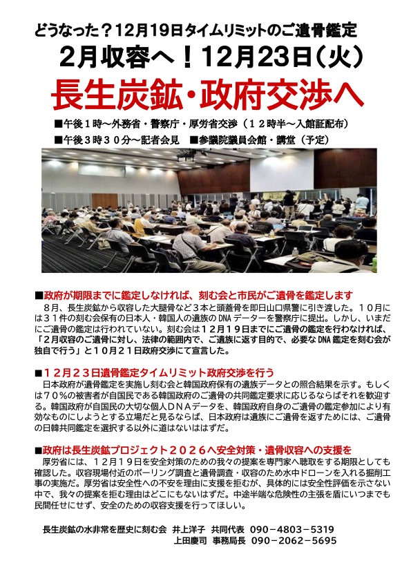 1時間近いやり取りに、確認できたのは「どの政府も含め、どの部署がするかも決まっていないがDNA鑑定は最終的にはすることにはなる」と言う事だけ。「こんな状況なら、ご遺族が生きている間にご遺骨を返すことはできない。ダイバーも命がけでご遺骨を収容している、市民のご遺骨を遺族に返したい思いで、幾度もの募金でこの収容を行っている。私たちがやりますよ。12月19日東京に軍人軍属の遺骨返還交渉で来るからその日をご遺骨鑑定と遺族との照合の期限にします。」と宣言することになった。日本でも韓国でも12月19日のタイムリミット宣言は各紙に報道された。12月19日の設定はただの圧迫ではない、法的、技術的準備に刻む会はすでに取り掛かっている。鑑定は刑法の犯罪の形式的要件を構成するが、長生炭鉱の遺骨収容と政府の対応の具体的状況の中で目的を明確に必要最小限の鑑定ならば違法性はない、違法性は阻却されるという法解釈が成立する。12月19日政府が何の鑑定も行わず、韓国政府の遺骨鑑定参加も認めていないならば、刻む会がご遺骨を遺族に返すため遺骨鑑定を行うことを社会に宣言し社会に問うていく決意である。