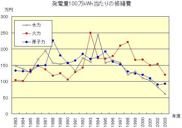 下のグラフは、火力、水力についても発電量100万kWh当たりの修繕費を求め、原子力と比較したもの。1995年を境に、原子力の修繕費は大幅に削減され、火力の修繕費を下回るようになる。2003年で火力の修繕費は、原子力の1.3倍である。