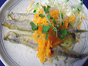 今回の台風はみさと屋の野菜や果物の産地を縦断して行きましたが、いまの ところ大きな被害は伝えられていません。 ■野菜食堂のおすすめレシピ ★ししゃものマリネ★ みさと屋の常備の冷凍魚「ししゃも」を使った料理です。そのまま焼いて食 べてもおいしいですが、ひと手間かけると豪華な料理になります。