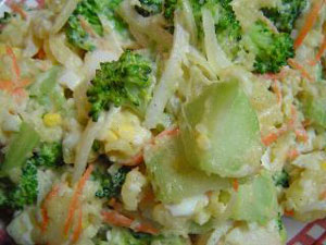 ★ブロッコリーごろごろサラダ★ なんということはないポテトサラダです。ブロッコリーをゆでてぶつ切りに して入れます。茎の部分も乱切りにして入れてしまいます。ゆで卵もたっぷり 入れるとおいしいです。ブロッコリーがおいしい冬場はキュウリよりおいしい ポテトサラダになります。