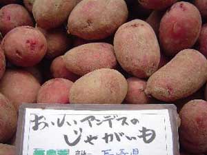 じゃがいもの原産地は、南米のアンデス地方ですが、日本でおなじみの形の もの以外に様々な品種があります。この赤い品種もその一種です。たいへん小 粒なのですが、味が濃くてたいへん美味、ゆでてそのまま食べるのが一番です が、素揚げにして食べたりしてください。しゃがいものビタミンCはリンゴの 約3倍といわれていて、しかも熱に強い形で含まれています。疲労回復の効果 が期待できるでしょう。皮ごと利用してこの色を生かしましょう。10個程度 の袋詰めにして量り売りにしています。