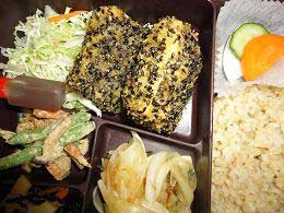 三陸の魚は原発事故後にとれたものは出荷されていませんので、みさと屋の海産物はこれから何が出荷されるのか不確定な状態です。このアジは日本海産(山陰)なので利用できています。 1.醤油1、みりん1、を煮切って、酢、ダシ汁も1の割合でタレを作って鷹の爪を入れておきます。2.小麦粉と片栗粉を半々で混ぜた衣をつけて揚げたアジを熱いうちに漬け込みます。3.人参やタマネギなどをお好みで一緒に漬け込んでください。お好きならセロリもおいしいでしょう。漬け込まない野菜も添えて盛ります。 ★豆腐のごまカツ★