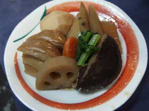 1.水切りした豆腐に2.人参や長ネギきのこのみじん切り、卵、小麦粉などを加えて練った具を3.下ゆでしたレンコンのスライスにはさんで4.パン粉の衣で揚げます。ランチの人気メニューですが、この日はお弁当の主菜になりました。 ★★くるま麩と野菜の煮物★★