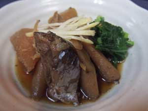 新鮮なサンマが手に入る季節です。サンマをぶつ切りにして骨ごと煮込む栄養豊かな料理です。みさと屋の下ごしらえ済みサンマを使えば簡単ですが、新鮮サンマの場合は1.頭を落として内臓を取り出した状態で骨ごと筒切りにします。骨ごと食べる料理なのでおろす必要はありません。2.圧力釜にぶつ切りにしたサンマと乱切りのごぼうをいれて水を張り、3.砂糖、醤油、酒、生姜のスライスを入れで少し濃いめの煮物の味に調整してから5分圧力をかけて煮ます。ふだんは料理に砂糖を使わない野菜食堂でも青魚を煮る場合だけは砂糖を使います。4.他にコメの研ぎ汁で下ゆでした大根も用意して、サンマとごぼうに加えて圧力をかけずにひと煮立させたら完成です。一度覚ますと味が染みておいしくなります。5.生姜の千切りをたっぷり添えます。