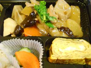 現在は伊豆八丈島の明日葉が入荷しています。それに人参やきのこを少し混ぜて揚げています。天つゆでも、塩だけでもおいしく食べていただけます。 ★豚肉と根菜のうま煮弁当★
