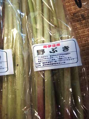 伊豆の山で採れる「野ぶき」山菜の一種です。自生しているものなので細くて皮をむくのがたいへんですが、味が濃くておいしいので苦労が報われる味です。畑で栽培したものより味、香りともに上です。この季節にしか味わえないものです。煮物や佃煮にしてぜひ食べてみてください。塩をまぶしてまな板の上で転がすように塩をすり込んでからゆでると皮がむきやすくなります。揚げといっしょに鰹ダシで煮るのが一般的です。 ■野菜食堂のかんたんレシピ ★★トマトのバジルサラダ★★
