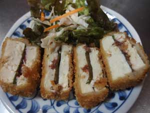 塩・コショウをふった豚バラ肉と青じそで水切りしたもめん豆腐を巻いて揚げます。写真は半分に切って盛り付けしたところです。いい豆腐を使わないと肉に負けてしまって味のバランスがとれません。野菜食堂では三多摩で一番といわれている府中の元気屋さんの豆腐を使っています。豆腐料理では下の写真の梅しそはさみフライも人気メニューです。日替わりメニューからお選びください。
