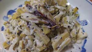 玉ねぎのみじん切りを炒め、豚ひき肉、卵、パン粉と牛乳少々、塩・コショウを加えてよく練ります。鰹ダシ汁にみりんと醤油で煮物の味付けをして長ネギのスライス、しめじ、エノキ、椎茸入れて煮ます。ハンバーグを小判形に成形してフライパンで焼いて、ダシ汁に入れます。添え物のじゃがいも、人参も加えます。食べる直前に片栗粉でとろみをつけて盛ります。店では写真のように大鍋で煮ています。 ★★サツマイモのサラダ★★