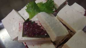 味が濃くておいしい元気屋さんの豆腐は揚げ物にも合います。写真のように青しそと梅びしおをはさんでフライにする料理が人気です。しっかりと水切りした木綿豆腐を縦半分にして、それを6等分、1丁を12等分にしたサイズで梅と青しそをはさみます。水溶き小麦粉とパン粉の衣で揚げます。