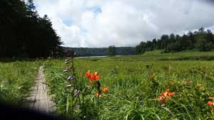 <週刊みさと屋通信・生産者からの便り> ■夏休みをいただきました。福島の田舎に帰省しました。 木曜日の営業を終えてすぐにクルマで出発して、福島に向かいました。大渋滞で着いたのは2時すぎになってしまいましたが、がんばって早起きして尾瀬へ。今回はハイキングだけが目的ではなく、東日本土壌放射能調査の空白区を埋めるための土壌採取を兼ねています。重い土のサンプルを4件と、野生のキノコまで欲張って1キロ集めたのを持って山道を歩いたので、足腰がボロボロになりました。しかしやはり夏の尾瀬はいいです。たくさんの花が迎えてくれました。土は群馬県片品村と、福島県桧枝岐村の貴重なデータとなります。写真は尾瀬沼に向かう花の道と、一瞬だけ見えた燧ケ岳です。